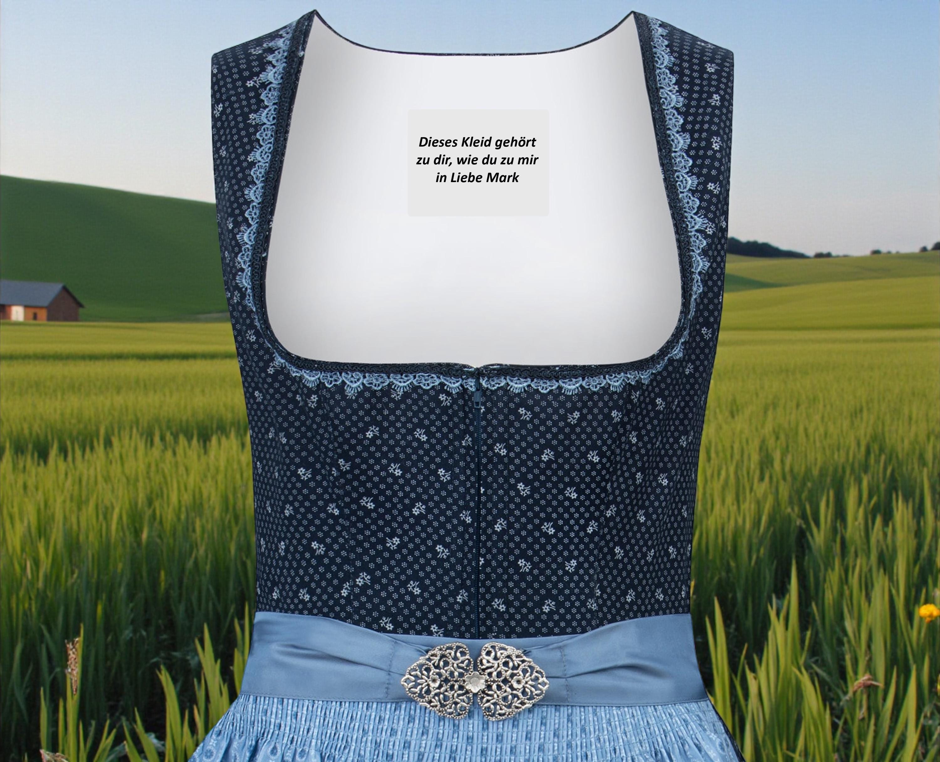 Trachtenhans proudly presents this dirndl in a deep blue. This classic model captivates with its subtle printed motif and is embellished with loving details. The straight neckline is adorned with elegant decorative ribbons, magically accentuating the décolleté. The traditional bodice closes discreetly with a zipper, perfectly rounding off the overall look. The apron with a trendy metal clasp emphasizes the feminine silhouette. An absolute must-have for all lovers of traditional costumes.