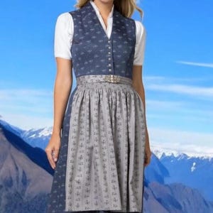 The lacing made of satin and organza ribbons underlines the elegant design and emphasizes the feminine silhouette. The look is rounded off by the delicate, color-coordinated and lined lace apron, which gives the dirndl a noble lightness. With a skirt length of 65 cm, the dirndl is perfect for festive occasions, folk festivals, or elegant celebrations.