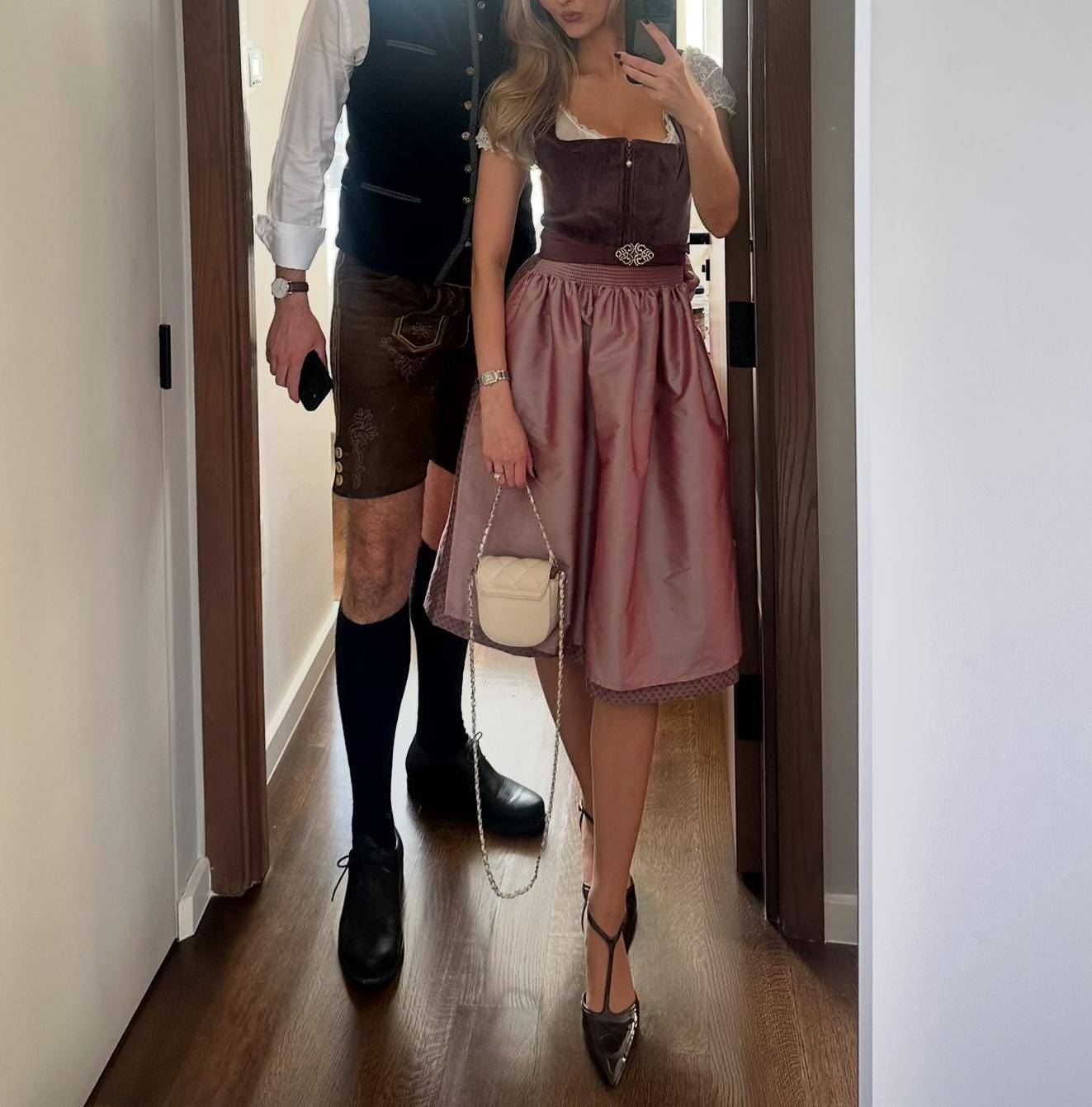 The stylish bodice, crafted from high-quality velvet, fastens discreetly with a zipper, harmoniously completing the look. The color-coordinated apron and skirt, made of exquisite jacquard, underscore the superior workmanship and attention to detail.
