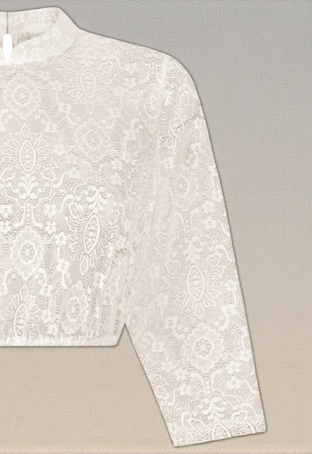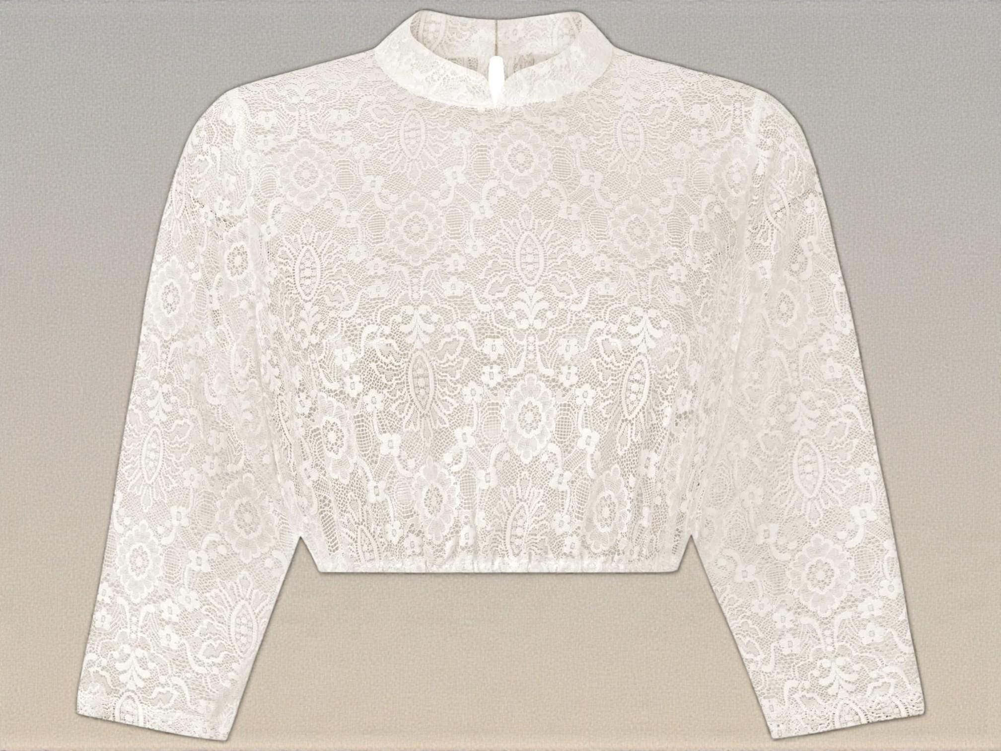This high-necked dirndl blouse in cream features an elegant floral lace pattern and embodies feminine elegance in its timeless design. The delicate stand-up collar lends every dirndl a stylish, graceful look – perfect for women who want to combine classic traditional dress with a modern, elegant touch.