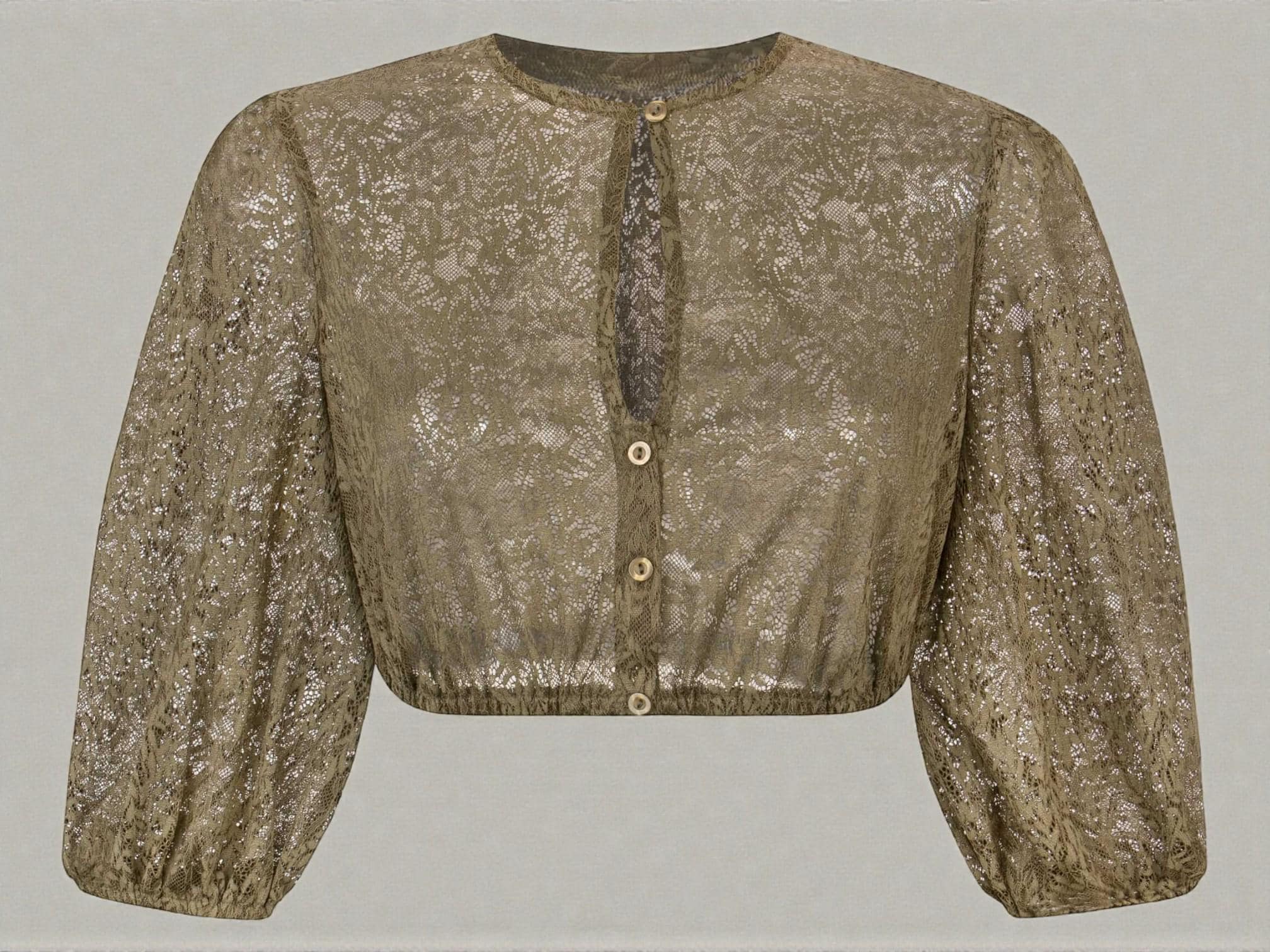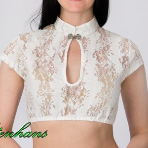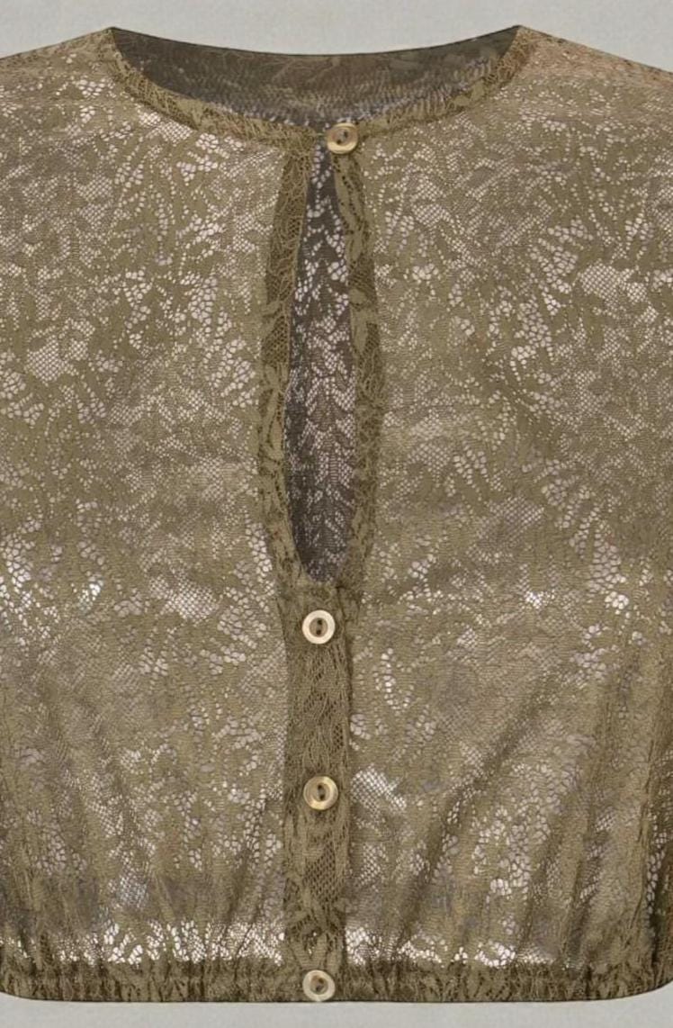 This high-necked dirndl blouse in olive green features an elegant floral lace pattern and embodies feminine elegance in its timeless design. The delicate stand-up collar lends every dirndl a stylish, graceful look – perfect for women who want to combine classic traditional dress with a modern, elegant touch.