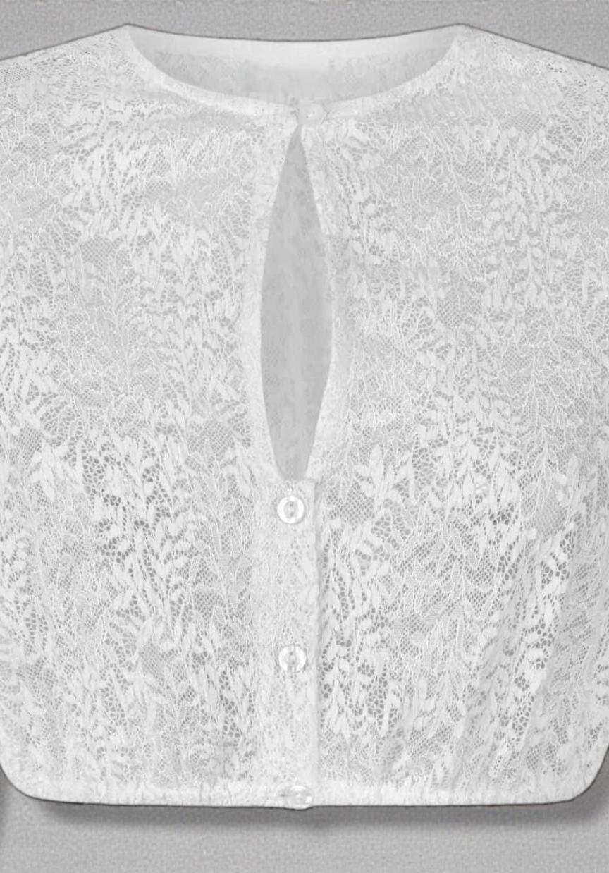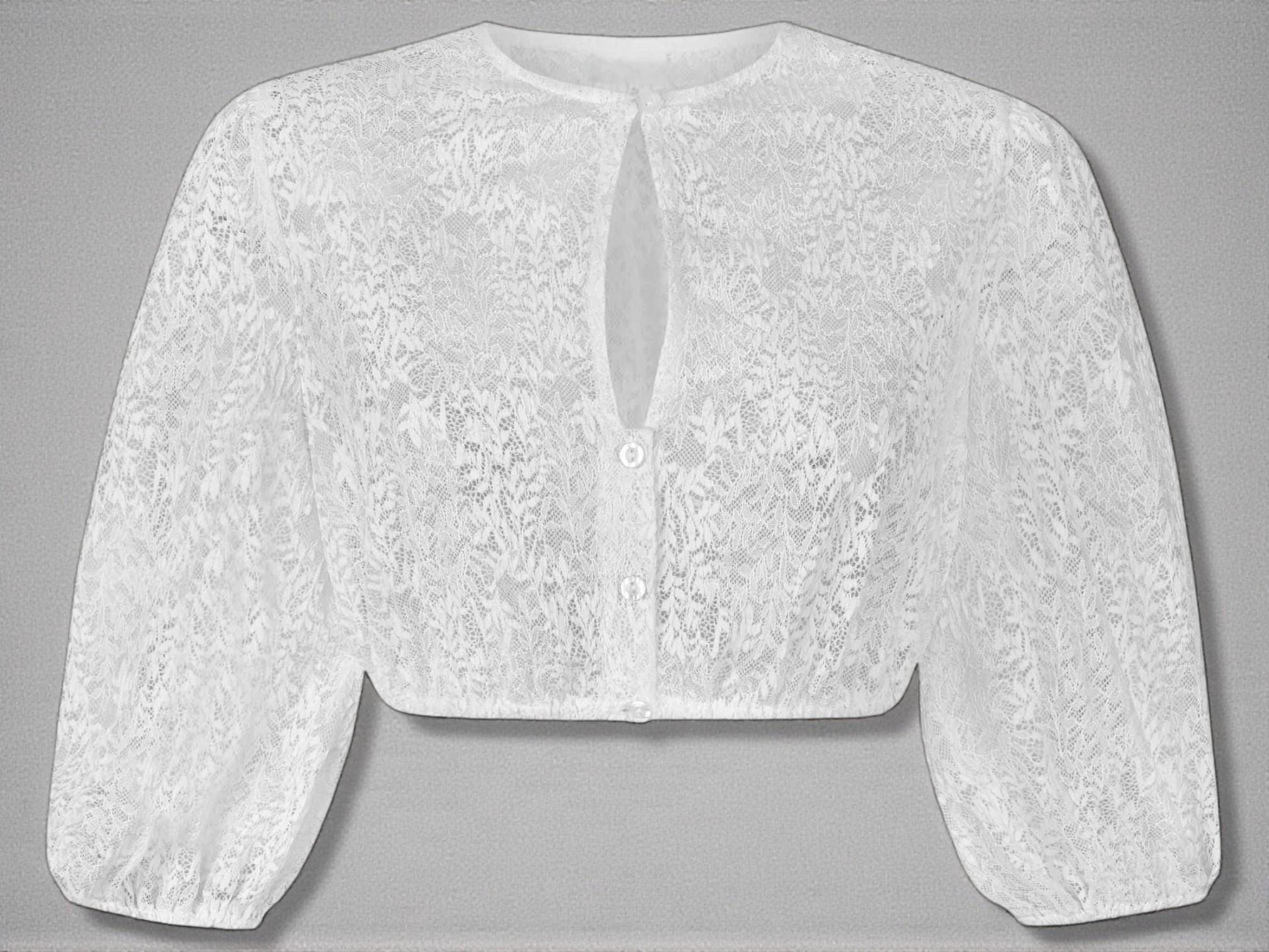 This high-necked white dirndl blouse features an elegant floral lace pattern and embodies feminine elegance in its timeless design. The delicate stand-up collar lends every dirndl a stylish, graceful look – perfect for women who want to combine classic traditional dress with a modern, elegant touch.