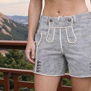 Damen Hirschlederhose Laufensee dunkelgrau Maßanfertigung einer maßgeschneiderten sämisch gegerbte kurze Trachtenlederhose Oktoberfest