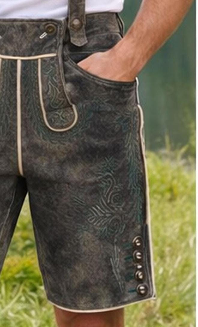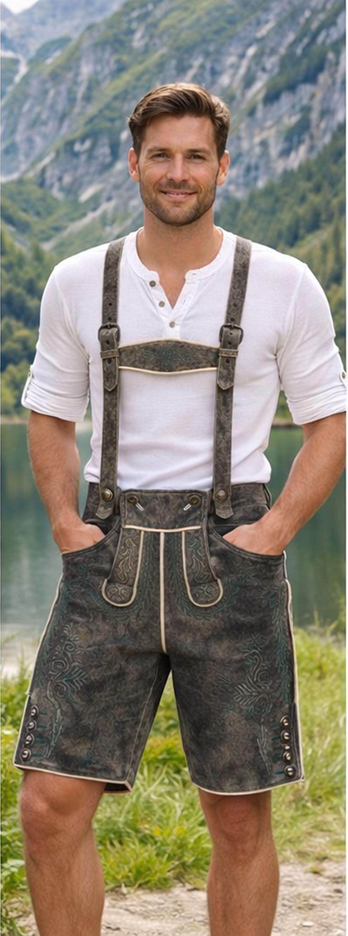 Herren Hirschlederhose Gosausee Dunkelgrau Maßanfertigung einer maßgeschneiderten sämisch gegerbte kurze Trachtenlederhose Oktoberfest