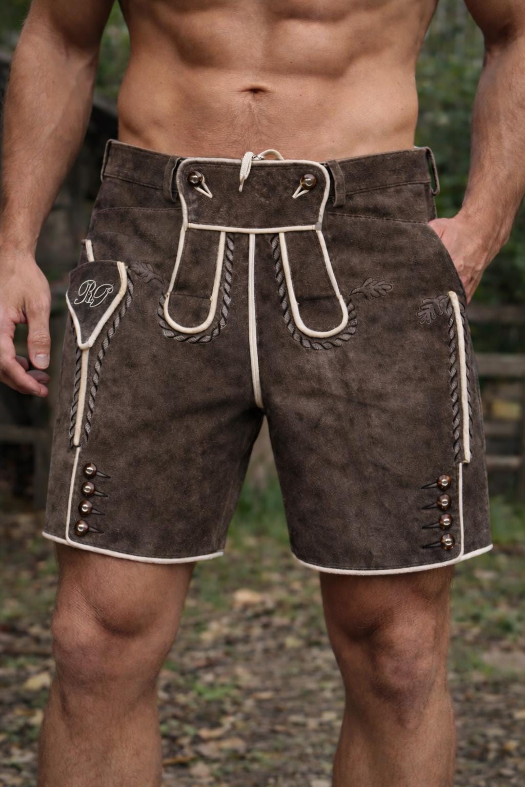 Herren Hirschlederhose Irrsee braun Maßanfertigung einer maßgeschneiderten sämisch gegerbte kurze Trachtenlederhose Oktoberfest