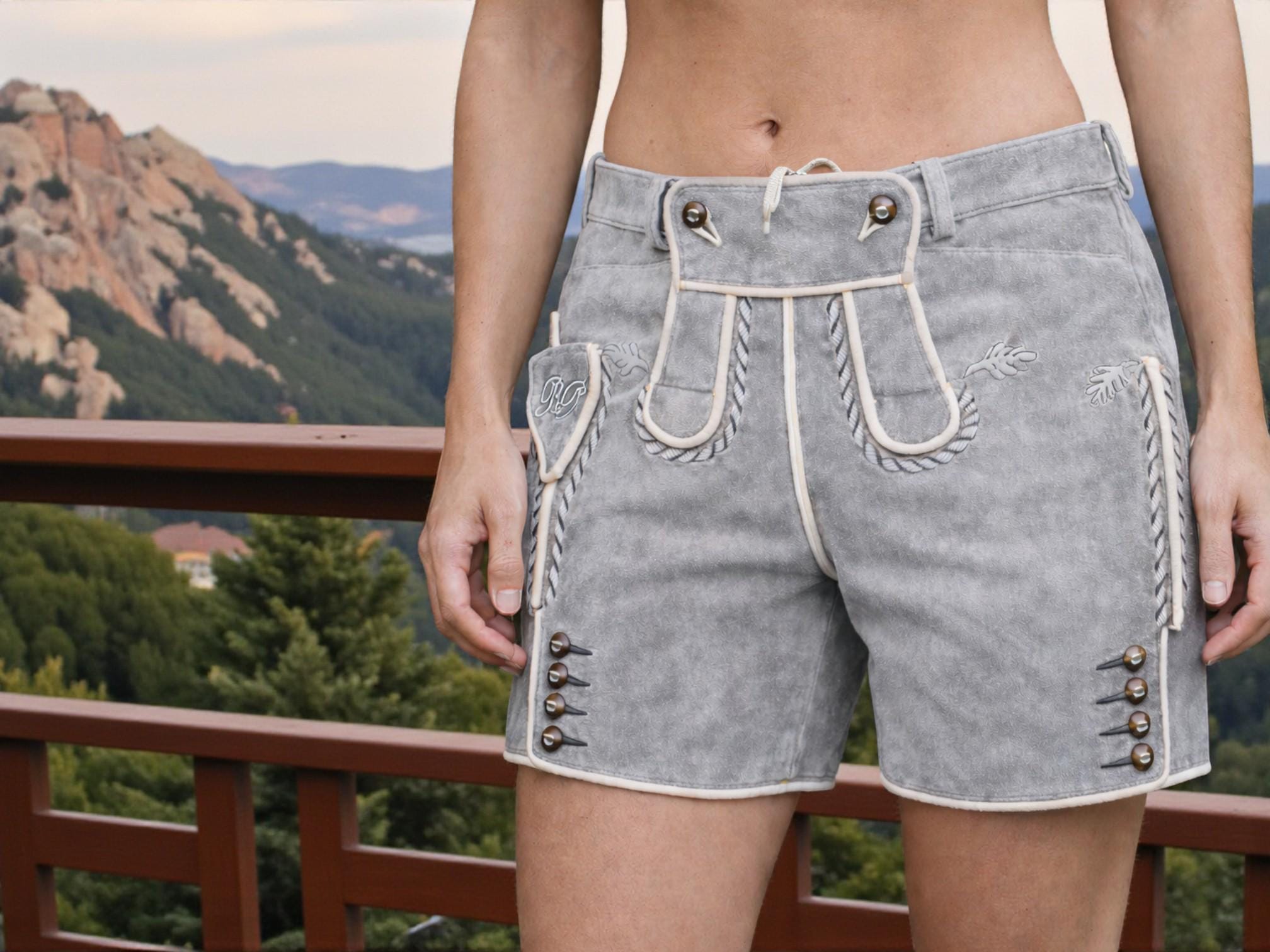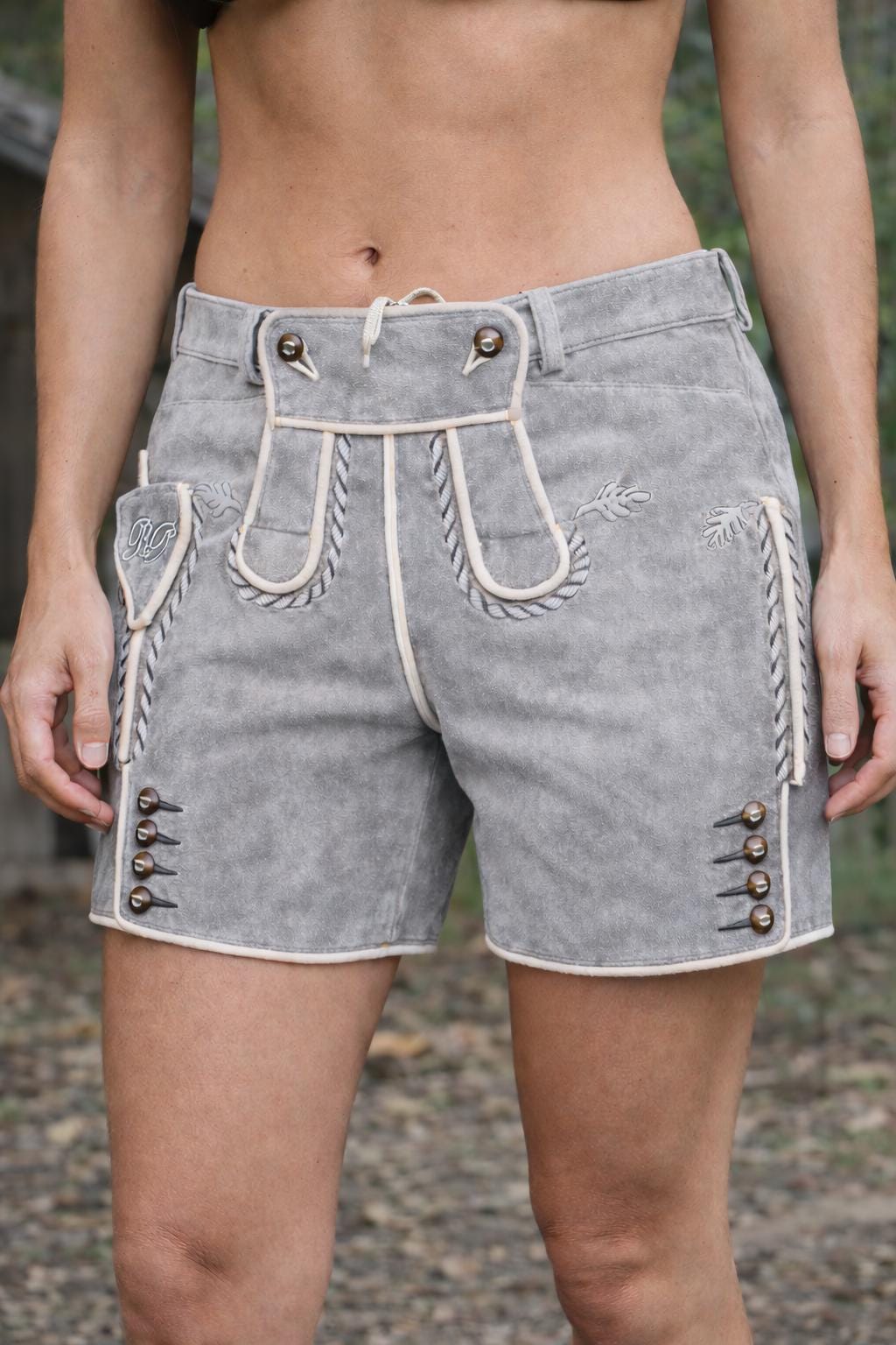 Damen Hirschlederhose Irrsee hellgrau Maßanfertigung einer maßgeschneiderten sämisch gegerbte kurze Trachtenlederhose Oktoberfest