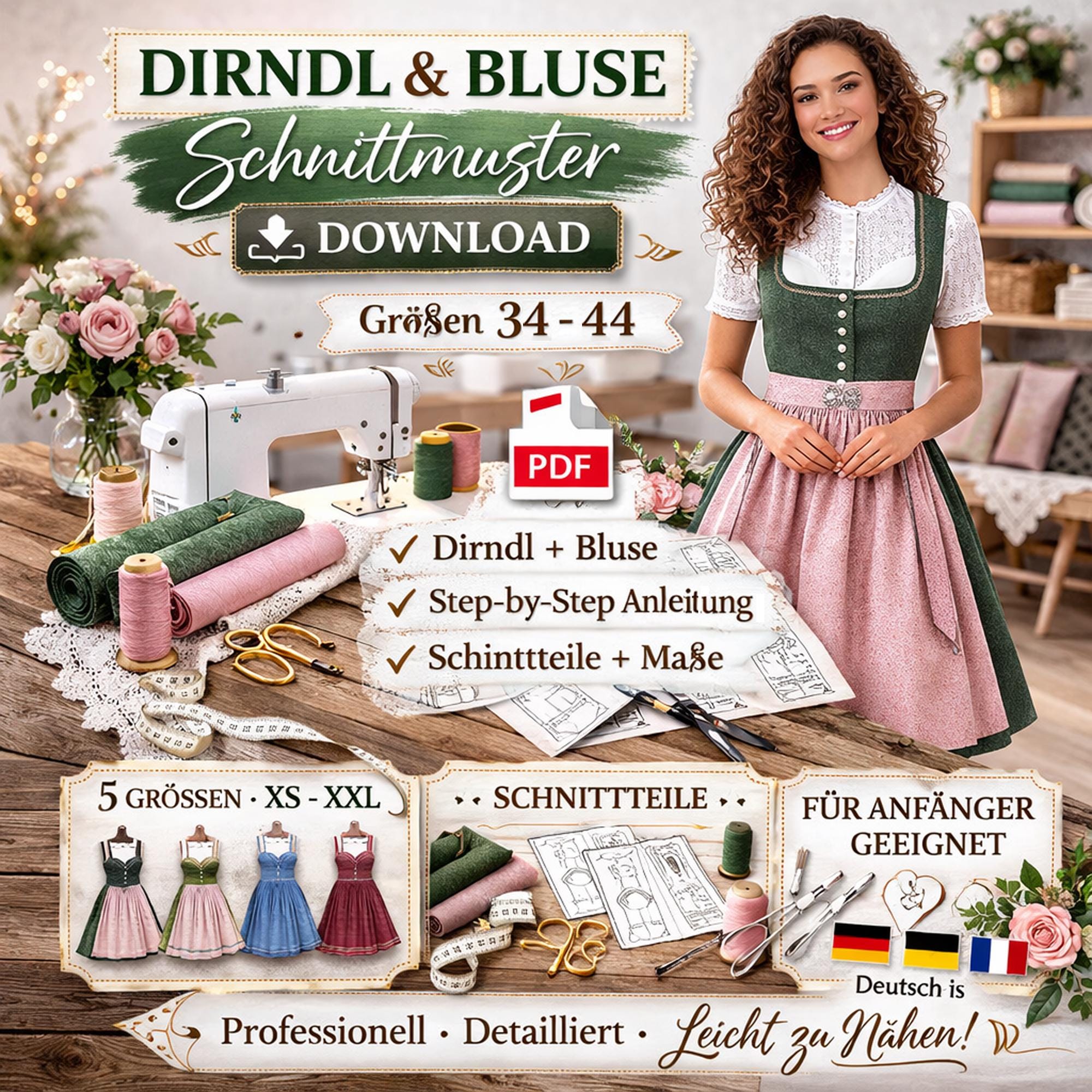 Dirndl sewing pattern + blouse for women (PDF) | Traditional dirndl sewing instructions | Dirndl dress pattern download | Multilingual, sizes 34-44