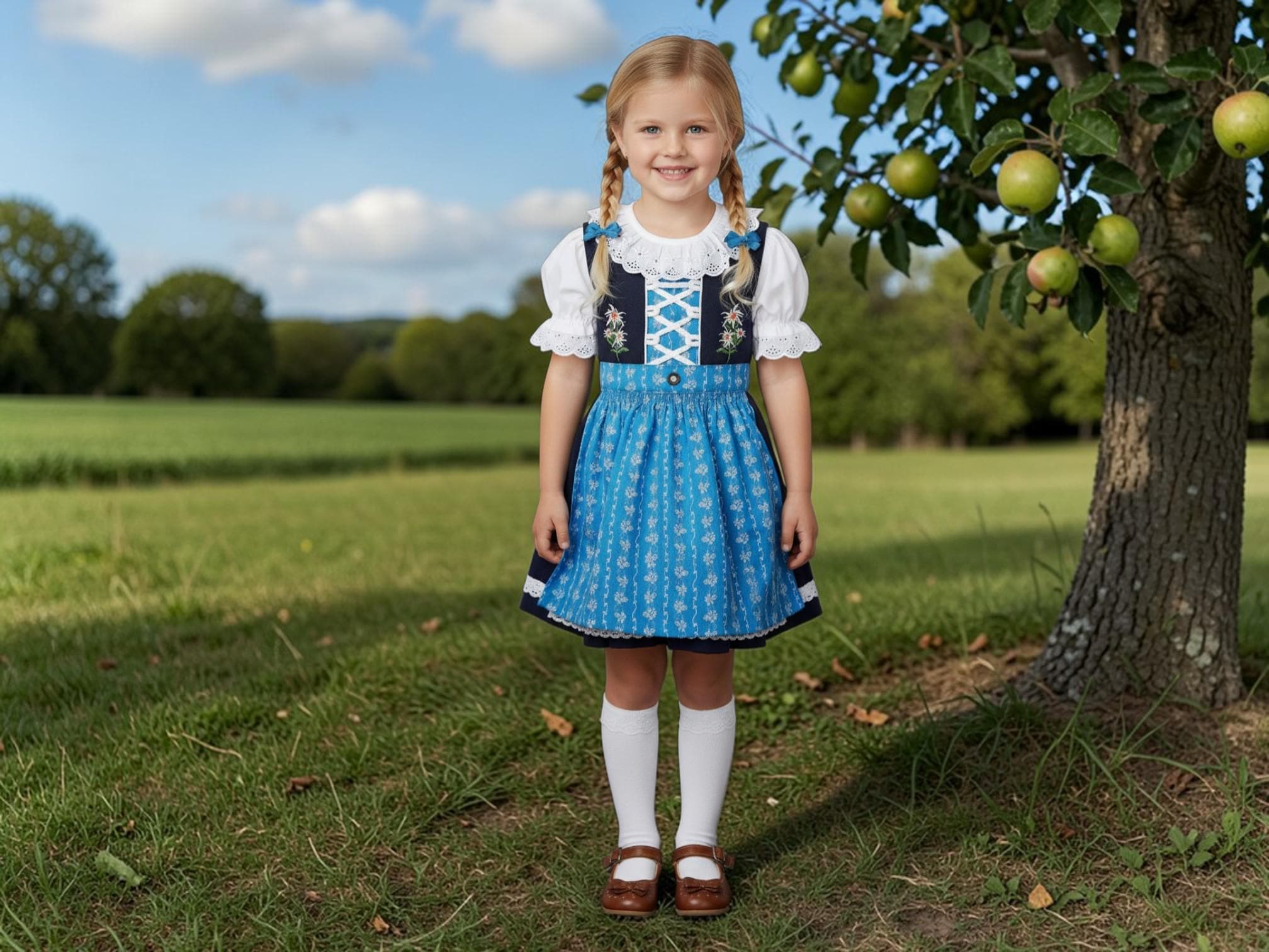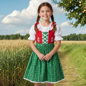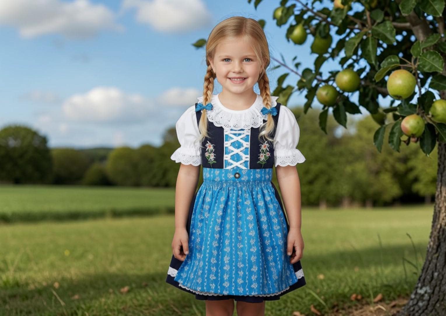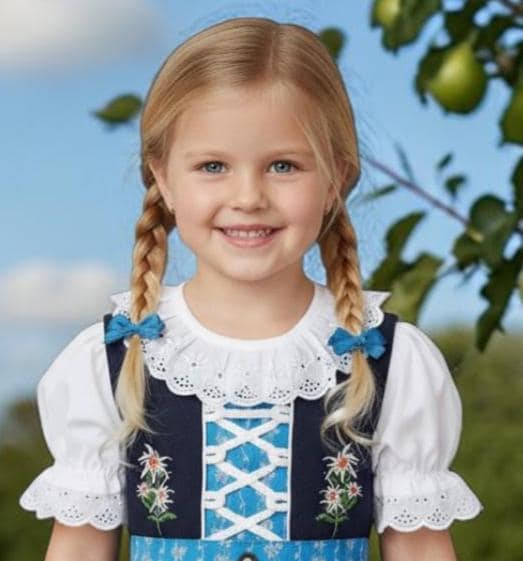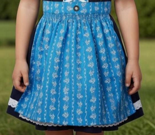 This charming 3-piece children's dirndl in blue and light blue combines traditional folk costume style with child-friendly comfort. The set consists of a dirndl dress, matching apron, and blouse – perfect for Oktoberfest, folk festivals, weddings, or family celebrations.