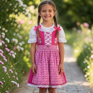 Made from high-quality cotton, this girl's dirndl impresses with its comfortable fit and easy-care fabric. The color-coordinated apron harmoniously completes the traditional look, while the blouse rounds off the outfit and ensures an authentic traditional style.