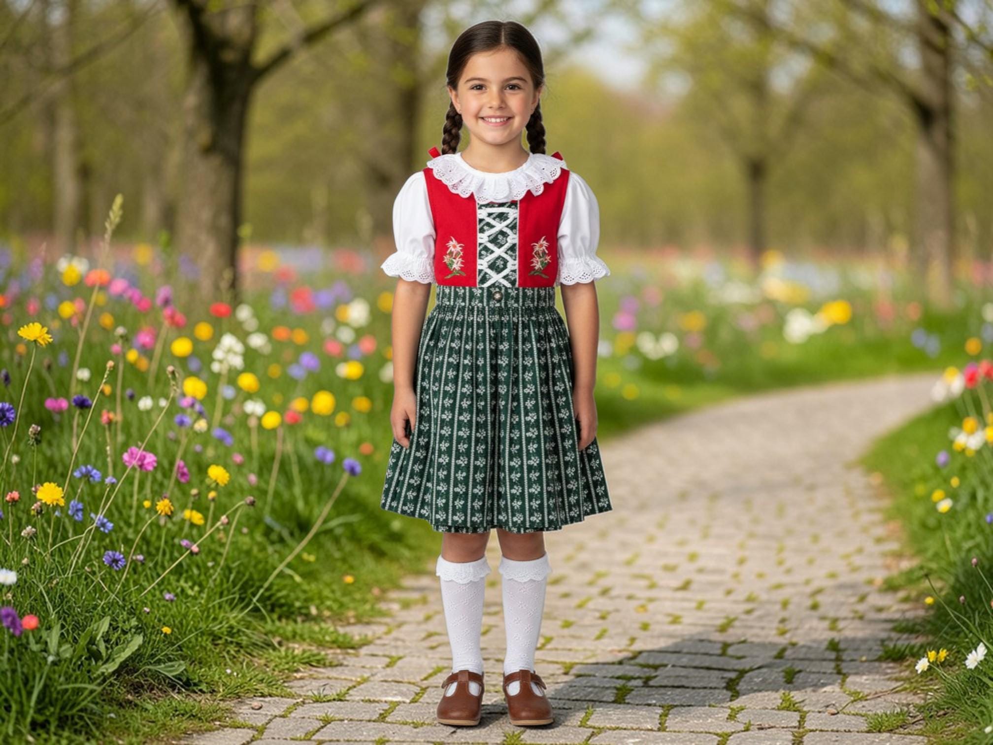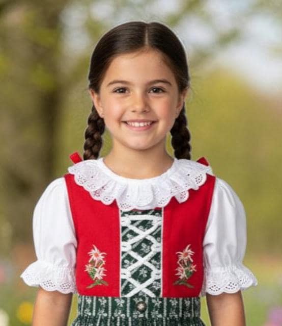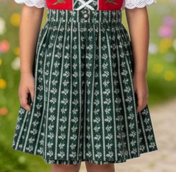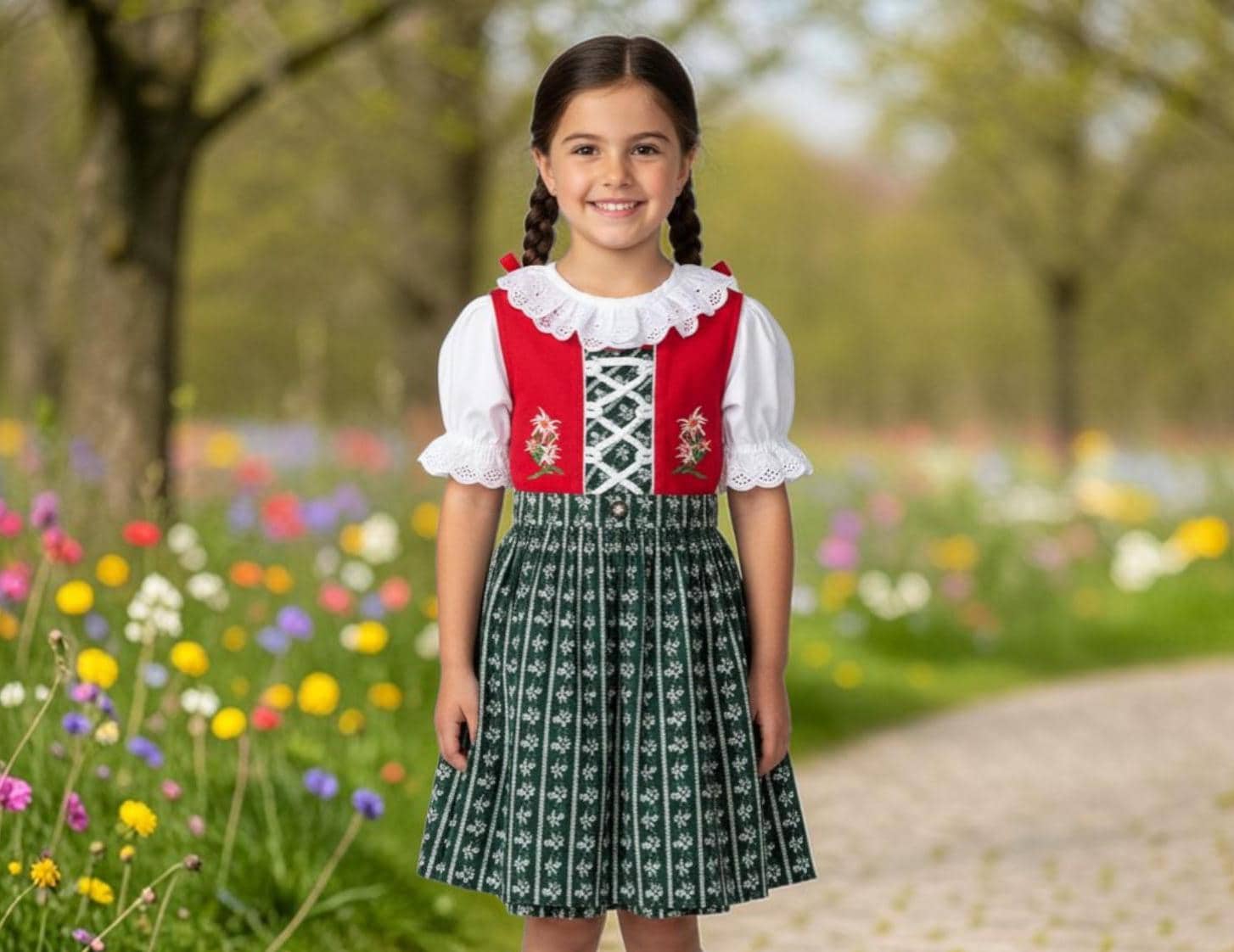 This charming 3-piece children's dirndl in red and dark green combines traditional folk costume style with child-friendly comfort. The set consists of a dirndl dress, matching apron, and blouse – perfect for Oktoberfest, folk festivals, weddings, or family celebrations.