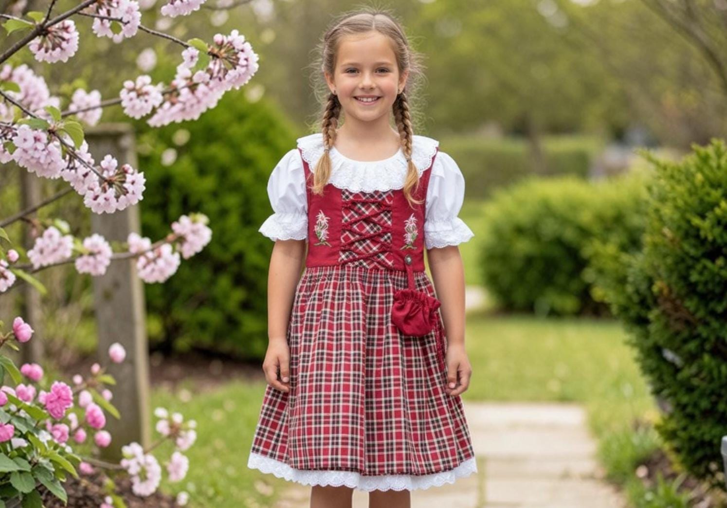 Children's Dirndl Dress, 3-Piece Set, Red Check, with Blouse & Bag, Cotton | Girls' Traditional Dress, Oktoberfest Festive Dirndl