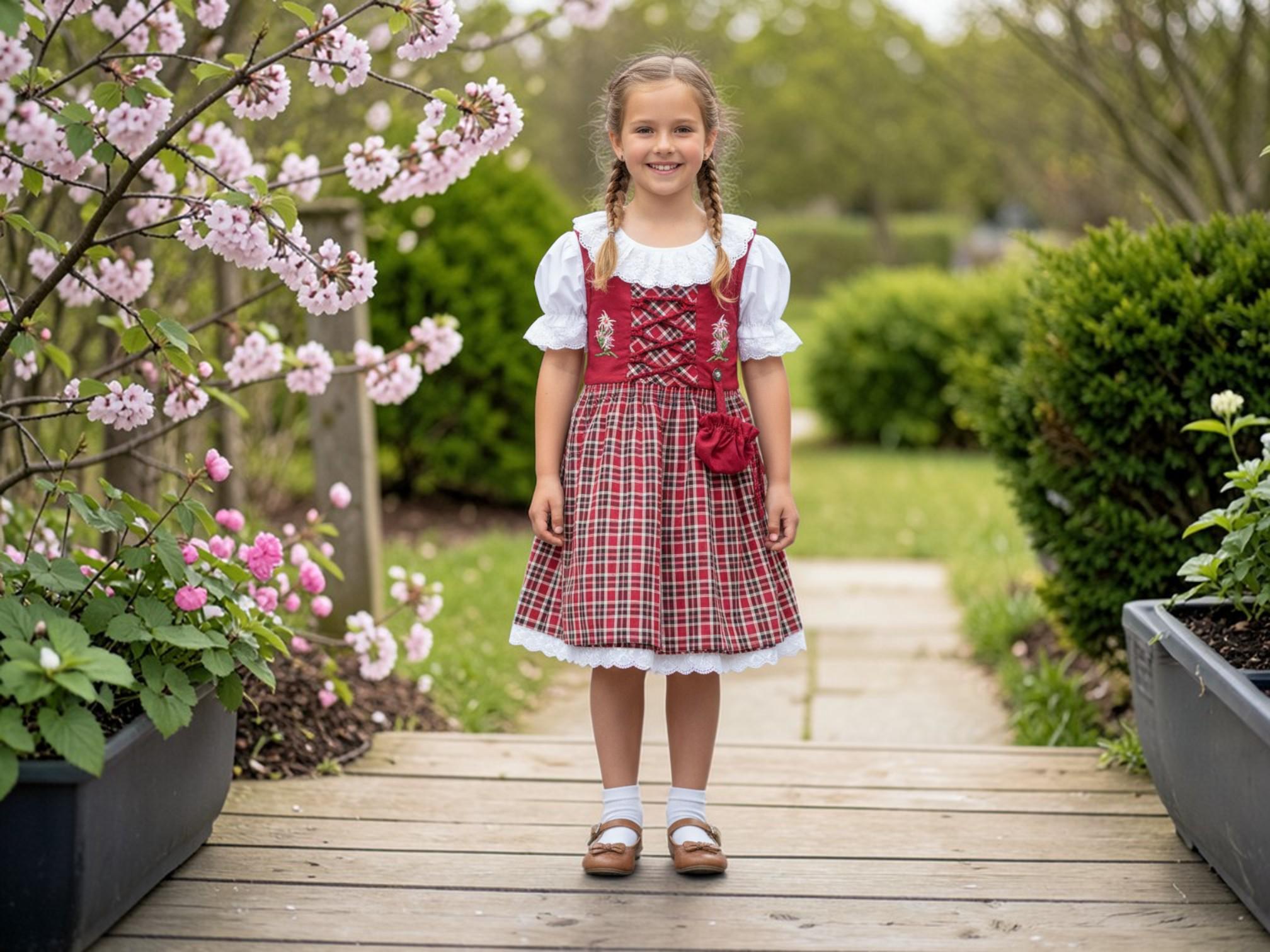 This charming 3-piece children's dirndl in red check combines traditional folk costume style with child-friendly comfort. The set consists of a dirndl dress, matching bag, and blouse – perfect for Oktoberfest, folk festivals, weddings, or family celebrations.